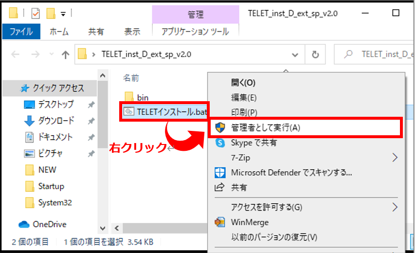 「TELETインストール.bat」を右クリックし、「管理者として実行」をクリックしてください。