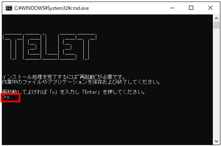 以下の画面が表示されたら、作業中のファイルやアプリケーションをいったん終了し、キーボードから「y」を入力し、「Enter」をクリックしてください。(※Windowsが再起動します。)